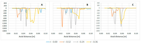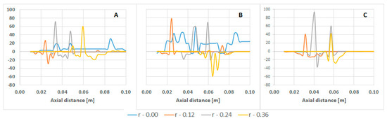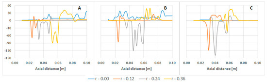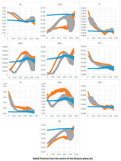 Figure 7, Figure 8 and Figure 9 show the emission profiles of this burner using ammonia/hydrogen at high pressures and high inlet temperatures with greater power outputs (Table 2). The results denote a considerable increase of hydrogen concentration compared to the atmospheric case. It is clear from the results that the production of hydrogen has increased in two orders of magnitude in the post-flame region. Moreover, although all cases show higher temperature profiles above 150 K, ammonia heavily appears in the post-flame region at concentrations >40,000 ppm, a problem observed with this burner configuration during previous experimental campaigns [39]. The increase of pressure seems to decrease the flame thickness, thus minimizing the reaction of the ammonia and hydrogen molecules, thus causing their high concentration at the core of the system and the outlet of the combustor. Surprisingly, NO still remains under similar values to those experimentally validated, i.e., 400–500 ppm. Although reduction of the molecule’s concentration was expected due to the lower combustion efficiency and increased concentration of ammonia (thus deNoxing effects), the higher inlet temperature has also increased reactivity, thus also the production of nitrogen oxide emissions [39]. Therefore, trends are as expected from all these results. Moreover, it is clear that flame profiles have changed. This is a consequence of an enhanced recirculation zone close to the wall (Figure 4), which increases in size and strength with temperature. This effect will impact on the final production/consumption of species. It is also known that the central recirculation zone will suffer at higher temperatures [43], thus reducing the swirl number in such a region. This will bring impacts towards the recirculation of species and further flame changes that will also account for the change in species reactivity.