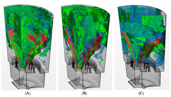 Isosurfaces (same opacities and thresholds) of the production of hydrogen (blue) through the destruction of ammonia (green) after the flame (red). Operating conditions: 900 kPa, 500 K. (A) 1450 K; (B) 1800 K; (C) adiabatic conditions.