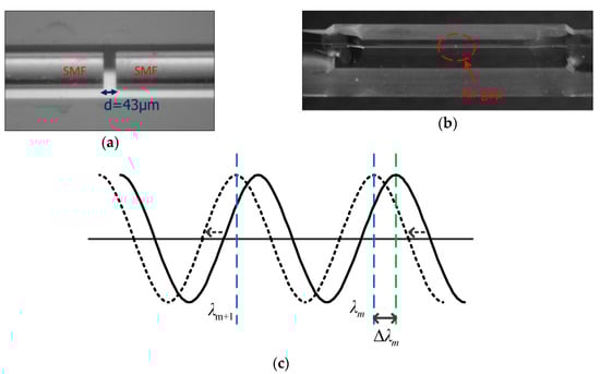 Based on Equation (10), one can conclude that the variation in RI (Δn) is in proportion to the variation in interference spectrum wavelength (Δλm). This also constitutes the theoretical basis of applying the proposed AGFFPI sensing device in measuring the electrolyte’s RI (n in the above Equations (6)–(10)).