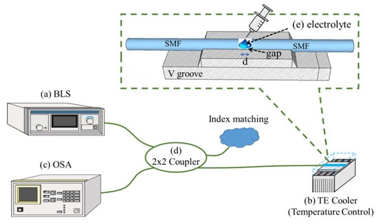 The experimental setup arranged for performing the tests is shown in Figure 4, including a broadband light source (BLS), an optical spectrum analyzer (OSA), a 2 × 2 optical coupler, and the fabricated fiber sensing device (AGFFPI) fixed on a V-groove holder in a thermoelectric (TE) module for controlling the electrolyte temperature. The experiment is performed as follows: The BLS sends a light signal (1250–1650 nm) that propagates through the optical coupler to excite the designed AGFFPI sensing device and two reflective signals are produced at the two fiber end faces in AGFFPI. Then, the reflected signals constitute an interference pattern propagating back through the optical coupler and into the OSA for spectrum recording and further analysis. Figure 5 shows the related electrolyte samples used in the experiments.
