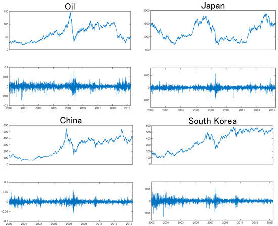 Our data consist of daily returns of crude oil and East Asian stock market indexes. West Texas Intermediate (WTI) Cushing Crude Oil Spot Price Index is selected to represent for oil prices. For East Asian stock markets, three representative East Asian countries are selected—Japan, China, and South Korea. All stock indexes are derived from the Morgan Stanley Capital International (MSCI) indexes. Our sample includes 4120 daily observations from 4 January 2000 to 28 October 2016. Table 1 presents the descriptive statistics. Clearly, all returns distributions are against normal as measured by the skewed distribution and excess kurtosis.