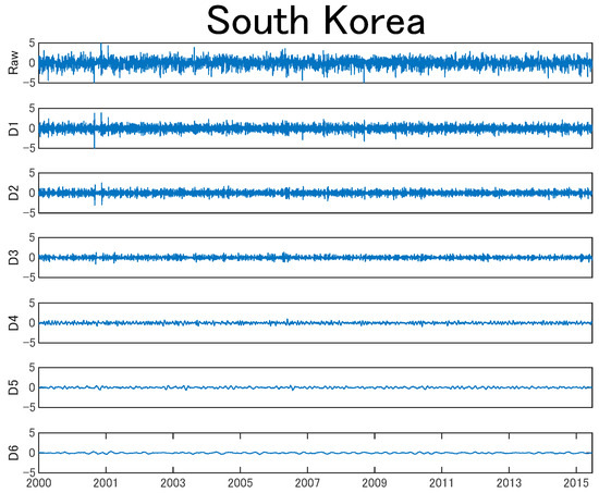 Wavelet decomposition of standardized residuals for crude oil and East Asian stock markets. Raw represents the original time series. D1 (two days) and D2 (four days) represent the short-term fluctuations. D3 (eight days) and D4 (16 days) represent for the mid-term. D5 (32 days) and D6 (64 days) represent for the long term.