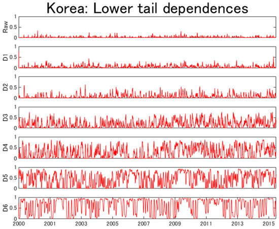 Figure 3 shows the time-varying tail dependencies by dynamic SJC copula for each of the oil-stock pair. These figures provide an intuitive impression into the time-varying tail dependence. Looking at these figures, we first find that tail dependencies varied significantly over time and differed in terms of the time horizons. The magnitude of these tail dependencies increasedas the time scales increased. Specifically, we found very weak tail dependence in the short term, which showed the absence of co-movements between crude oil and East Asian stock markets during very short time. However, the tail dependence increased as the time scales increased and differed in bear and bull markets. These results suggest that crude oil market was more likely to be tail dependent with East Asian stock markets in the mid- and long-term than in the short term. In other words, oil market would, but not simultaneously, react to the same extreme events with East Asian stock markets. The possible reasons are (1) the accurate assessment of the market impact of extreme shocks, costing investors some time, and (2) the gradual information diffusion hypothesis by [32]. These results are important in terms of hedging strategies and portfolio risk management.