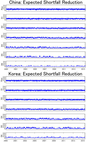 Figure 4 displays dynamic PV and ES reduction effectiveness. These plots offer graphical insights into the nature of the dynamic hedging and downside risk reduction at multiple time scales. Clearly, most values are positive over time and across frequencies, implying that crude oil is useful in reducing the risk and downside risk of East Asian stock markets over the whole sample period. The short-term hedging benefits are stable, while the mid- and long-term PV and ES reduction ratios vary dramatically over time. Moreover, the hedging benefits have been reduced in the long-run.