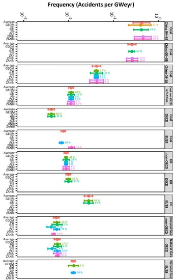 When focusing on the average BMA values shown in Figure 1, it is clear that the Chinese Coal chain has the highest normalized frequency. However, between the different time periods, i.e., 1994–1999, 2000–2008 and 2009–2016, the normalized frequency is decresing, approaching the other non-OECD countries. This result is explained by the last decade policy of the Chinese government on closing small private mines in order to move the entire Coal production to more safe and regulated large mines [,]. For this reason, Coal China should be treated separately to gain information on the advancement of the safety and regulatory approach adopted by the Chinese government. Furthermore, Coal accident frequencies are lowest in OECD, closely followed by EU28, and highest for non-OECD without China, but still almost one order of magnitude lower than for Coal China. For both Oil and Natural Gas, EU28 performs worse than non-OECD and OECD, while for the latter two no significant difference is found. This could be explained by the significant lower production of both Oil and Natural Gas in EU28 with respect to OECD and non-OECD countries (Table 2), which is not compensating the number of accidents in the country group (Table 1).