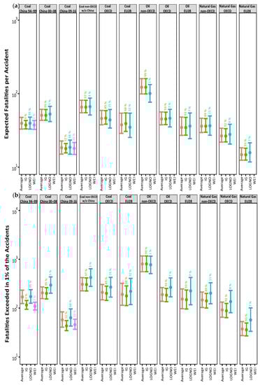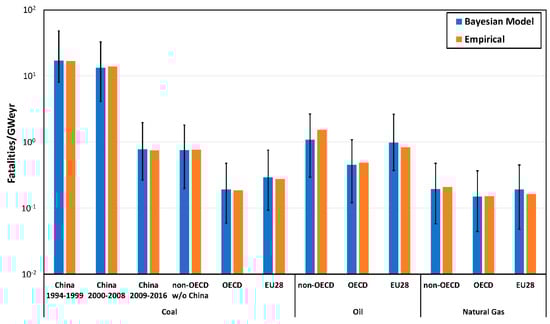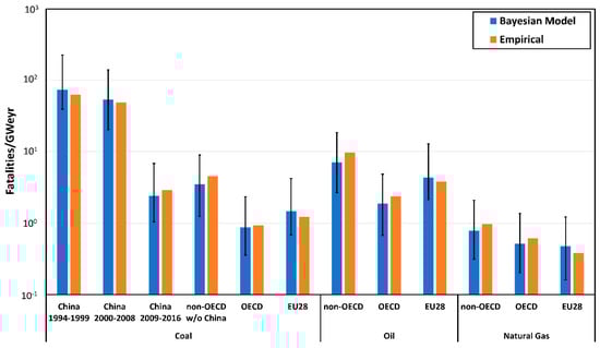 Finally, the results for accident frequencies (i.e., number of accidents per average annual production in GWeyr) and severity of the resulting consequences (i.e., expected fatalities per accident) were combined to compare overall risk between different energy chains and country groups. Two scenarios were considered, namely, the mean or expected scenario expressed as the expected number of fatalities per GWeyr, and the extreme scenario, defined by the threshold exceeded for a specific return frequency (i.e., exceeded at 1% of the accidents per GWeyr). In both cases, this is done by multiplying the results for frequency in Section 4.1 with the ones for severity in Section 4.2. Both indicators are based on accidents recorded in the period 1970–2016, except for Coal China, where three separate periods (1994–1999, 2000–2008 and 2009–2016) are considered due to different completeness of the datasets. In this context, comparative analysis among expected values could be made taking into account that for all energy chains, unless Coal China, effects such as technological improvements and change in safety regulamentations are not taken into account, while in the Coal China periods, they are potentially affecting the results []. Furthermore, to validate the BMA results, the expected fatalities and the fatalities exceeding 1% of the accidents are additionally estimated using an empirical approach. In particular, the validation consists in a check if the results from the empirical approach fall into the confidence levels modelled using the BMA approach. If this is the case, then the BMA result can be considered statistically correct. In terms of empirical analysis, the expected fatalities are estimated as an arithmetical mean, while the fatalities exceeding the 1% of the accidents are estimated as the number of fatalities at the 99% quantile of the historical distribution (Figures S4–S6).