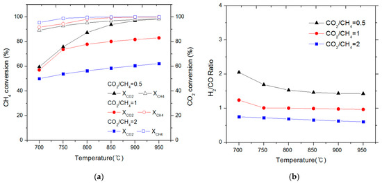 (a) Effects of CO2/CH4 ratio on CO2 and CH4 conversion rates during a simulated biogas reforming reaction; (b) Effects of CO2/CH4 ratio on H2/CO ratio during a simulated biogas reforming reaction.