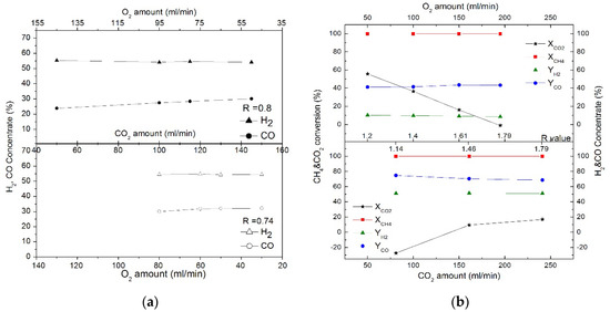 The relationship between the amounts of oxidizing agents (CO2 and O2) in CH4 and CH4 was investigated. Figure 2a shows the effect of oxidants on the yields of H2 and CO at 180 cc/min (R = 0.74) and 195 cc/min (R = 0.8). When the proportion of CO2 was increased (the amount of O2 was decreased) in the same amount of the oxidizing agent, the yields of H2 and CO remained almost unchanged. When the flow rate of the O2 or CO2 oxidant is constant, the change in the R value is >1, as shown in Figure 2b. There is little effect on the CH4 selectivity and the yield of H2 and CO produced; however, the CO2 conversion rate decreases as CO2 decreases and O2 increases. It is thought that the conversion rate decreases with the ratio of CO2 in the reactants. Because the effects of oxidants CO2 and O2 are similar to those of CH4 and CO2, the effects of O2 and CO2 as a factor of CH4 oxidants were analyzed for a CO2/CH4 ratio of 0.5. In addition, when R ≥ 1, because the CO2 conversion rate is considerably reduced [25,28], the effect of the oxidizing agent at R < 1 will be examined.