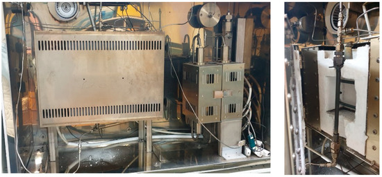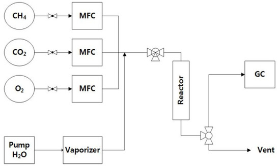The experimental apparatus is shown in Figure 3 and Figure 4. In the experiment, 4 g of catalyst was placed in the middle of a reactor with an inner diameter of 25 mm and length of 150 mm. The reactor temperature was controlled by an electrical furnace, and the reactor pressure was maintained between 1 and 15 atm. The gas hourly space velocity (GHSV) was calculated using Equation (1), where Q is the volumetric flow rate and V is the volume of the catalyst. The biogas was mixed with the simulated gas. As mentioned above, the experiment was carried out for a CO2/CH4 ratio of 0.5. Additionally, the amounts of CO2 and O2, which serves as an oxidant for CH4, were defined as R (≡ (O2 + CO2)/CH4). The R value was varied between 0.6, 0.7, and 0.9 in the experiments (Table 2). Furthermore, steam was added at a flow rate of 125 cc/min to examine the effect of steam addition on biogas reforming.