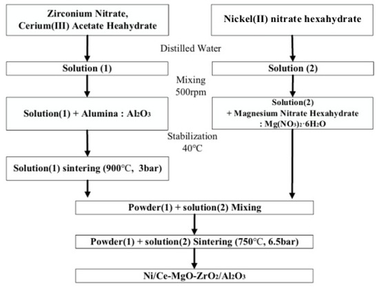 The catalyst was prepared, as illustrated in Figure 5, by using the appropriate amount of γ-Al2O3 as the support for loading and preparing a slurry of zirconium nitrate (Zr(NO3)4) and cerium acetate hydrate (CH3CO2)3Ce·6H2O). The slurry was evenly mixed at 500 rpm and stabilized at 40 °C to produce Solution (1). Solution (1) was sintered at 900 °C for 3 h in a sintering furnace to obtain powder (1). Next, Solution (2) was converted to a slurry by mixing nickel (II) nitrate solution and magnesium nitrate. Solution (2) was impregnated with powder (1) and sintered at 750 °C for 6.5 h in the sintering furnace to obtain 3 wt% Ni/Ce-MgO-ZrO2/Al2O3 catalyst [29,30].
