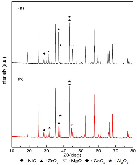 Precursors (CeO2 and ZrO2) for Ni- and Co-based catalysts include oxygen, which can prevent catalyst deactivation because carbon is oxidized by oxygen. ZrO2 reduces NiO to Ni, while preventing the formation of deactivated NiAl2O4 [10]. Carbon is known to form on the acidic surface of the support, and the use of basic co-catalysts (CaO, MgO) can improve the resistance to carbon formation [11]. MgO reportedly enhances the binding force in the presence of NiO, which improves the resistance of Ni-based catalysts to sintering and carbon formation and facilitates the highest catalytic performance [12].
