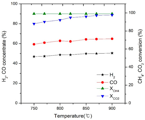In biogas reforming, the R value was set to 0.7, which was close to the stoichiometric ratio. The effect of temperature on the CH4 and CO2 conversion rates and syngas yield are shown in Figure 8. With the increase in temperature, the CO2 conversion rate increased and the CH4 conversion rate was close to 100%. As the temperature increased, the syngas yield (H2 + CO) increased. The activity increases with increasing temperature, and the yield of syngas seems to increase slightly [36].