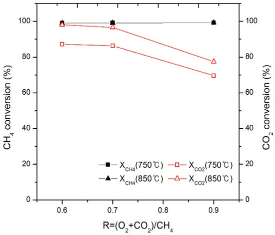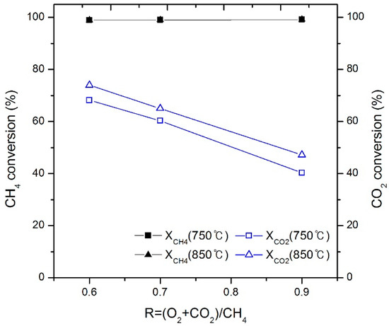 The effect of the R value (0.6, 0.7, and 0.9) on the CH4 and CO2 conversion rates is shown in Figure 9. The CH4 conversion rate is close to 100% regardless of the R value. This result is similar to that reported by Li et al. [21]. However, the CO2 conversion rate is 98% at the R value of 0.7 and decreases with higher R values. As the R value increases, the amount of O2 increases and CO and C generated from CH4 react with O2 to produce CO2, which can be attributed to the decrease in the CO2 conversion rate [37].