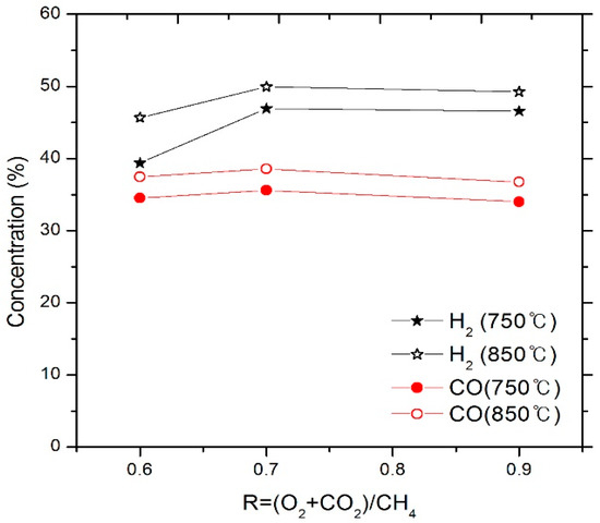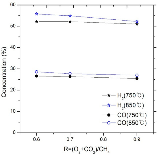 The effect of steam on the biogas reforming reaction is shown in Figure 11 and Figure 12. The CH4 conversion rate was close to 100% at 750 °C and 850 °C, regardless of the R value. It is believed that adequate amount of O in the steam could have increased the CH4 conversion rate. On the other hand, the decrease in the CO2 conversion rate is due to the increase in the number of O molecules owing to the increase in the R value, compared to the stoichiometric ratio. Thus, because of the increase in the amount of O, the re-oxidation reaction with CO occurs. With the increase in the R value, the CO concentration remains almost unchanged; the H2 concentration, which remains constant at 750 °C, tends to decrease at 850 °C. It is believed that H2 produced from CH4 reacts with O2 at 850 °C to produce H2O, which in turn reduces the yield of H2.