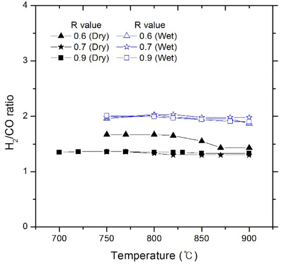 Figure 13 shows the H2/CO ratios in the dry reforming and wet reforming. The reactions for DME and methanol syntheses were performed according to the H2/CO ratio of the syngas. In the case of dry reforming, the H2/CO ratio is ~1.2 to 1.6, which is the highest when the R value is lower. In the case of wet reforming, the H2/CO ratio is ~2.0. Thus, wet reforming results in a higher H2/CO ratio than dry reforming because a larger amount of H2 is produced from steam.
