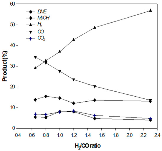 The syngas produced by dry reforming is suitable for the generation of high-value-added products through DME synthesis at the stoichiometric ratio (H2/CO = 1). In the case of wet reforming, the H2/CO ratio is ~2; thus, methanol can be produced through methanol synthesis in which the stoichiometric ratio of H2/CO is 2. Therefore, DME and methanol syntheses were carried out over the Cu-ZnO/γ-Al2O3 catalyst. The experiment was conducted at 60 bars in the temperature range of 200–300 °C. The effects of the H2/CO ratio on DME and methanol yields were analyzed (Figure 14). The DME yield was the highest for the H2/CO ratio of 1.0–1.2, and it decreased when the ratio was higher than 1.2. Therefore, dry reforming can be used for the DME synthesis, as mentioned previously.