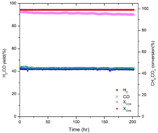 (6) The stability of the 3 wt% Ni/Ce-MgO-ZrO2/Al2O3 catalyst was evaluated at 845 °C for 200 h biogas reforming. It was found that the CH4 conversion rate remained constant at ~99%, and the CO2 conversion rate remained at ~97%. Therefore, the catalyst is expected to maintain high stability.