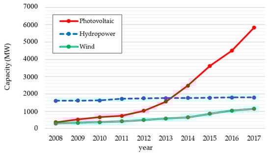 In Korea, solar energy is emerging as a clean and sustainable energy resource, with its biggest advantages being its ability to supply energy globally and the lack of concern over its depletion []. The installed capacity of solar PV in Korea has increased by more than 16 times over the last ten years, and now solar energy has become the largest renewable energy source in Korea, followed by hydropower and wind power (Figure 1). However, solar electricity production can fluctuate according to weather conditions, which hinders the stability and efficiency of PV systems. Thus, the accurate estimation and prediction of solar resources is essential to alleviate the uncertainty of solar PV systems and promote their grid penetration. This importance of solar resource estimation, however, has been overlooked in installing PV systems in Korea because of limited ground level solar irradiance data.
