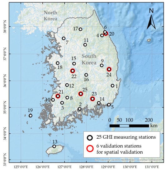 Solar irradiance measurement data are also necessary to train and test the ANN model. The Korea Meteorological Administration (KMA) has been measuring global horizontal solar irradiance (GHI) at 38 automated synoptic observing system (ASOS) weather stations throughout Korea. The recorded GHI values are accumulative values for an hour. In this study, data from some stations were excluded as they showed a significant decline or discontinuity of GHI values in recent years compared to the previous 10 years. The stations that showed a dramatic and discontinuous reduction of daily maximum GHI—by more than 200 Wh/m² in 2016 and 2017—were excluded. Since the sudden decrease pattern in the daily maximum GHI values they recorded is physically impossible, it must have been due to measurement errors caused by sensor degradation. As a result, data from 25 stations were selected and used (Figure 2). These COMS MI images and ground GHI measurement data were acquired for 2016–2017.