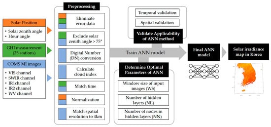 Therefore, the aim of this study is to improve the solar irradiance estimation accuracy for Korea by building an ANN model using COMS satellite data. In order to improve the performance of the ANN, the basic structure of the ANN model was determined by changing training parameters, including the extent of input satellite data, the number of hidden layers, and the number of nodes in each hidden layer. Then, after validating the applicability and generality of the ANN model for solar irradiance mapping, the final ANN model was trained and evaluated. This final ANN model was used to produce solar irradiance maps of Korea, so that the solar irradiance over Korea was estimated.