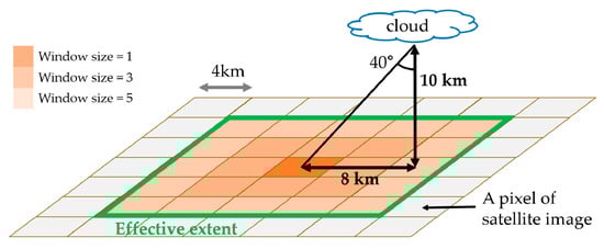 WS is the width of the satellite image that was to be used as input. A WS of 1 refers to the use of one exact pixel, and an increase of the WS means the use of additional nearby pixels. WS 3 uses nine nearby pixels, and WS 5 uses 25 (Figure 4). Since the sun is not always in the vertical position, it is necessary to identify surrounding clouds to consider their shadows. Using nearby pixels means that these surrounding clouds can be considered. For example, when using WS 5, it is possible to consider a cloud at an approximately 8 km distance. This means that when the height of the cloud is 10 km, it is possible to consider cloud shadow up to approximately 40° of the solar zenith angle (Figure 4). The larger the WS, the wider the range that can be considered, but the amount of data exponentially increases. Therefore, considering model efficiencies, WSs of 1, 3, and 5 were analyzed in this study.