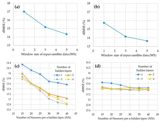 rRMSE of models with various ANN construction parameters; (a) rRMSE in the training set according to the width of the satellite image (WS) (NN = 15, NL = 1), (b) rRMSE in the test set according to WS (NN = 15, NL = 1), (c) rRMSE in the training set according to NL and NN (WS = 5), (d) rRMSE in test set according to NL and NN (WS = 5).
