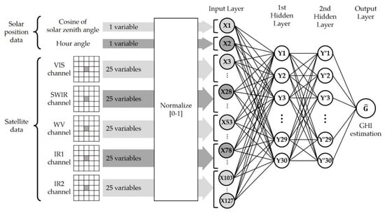 In recent years, in addition to these traditional approaches, the artificial neural network (ANN) has been recognized as a powerful tool for estimating solar irradiance from satellite images []. ANN can be a good alternative to traditional methods for the estimation of solar irradiance in Korea, because it does not require complex physical models or atmospheric parameters. Furthermore, if a sufficient amount of data is available, ANN is known to be more effective than conventional statistical methods for solving complex problems, especially when it is difficult to derive theoretical models []. Therefore, applying ANN can be a good choice for the estimation of solar irradiance, because solar radiation reaches the ground after making complex progress through the atmosphere, including transmission, absorption, scattering, and reflection.
