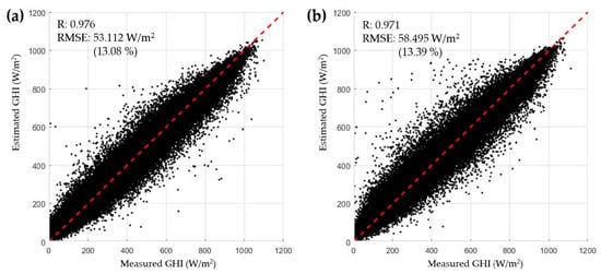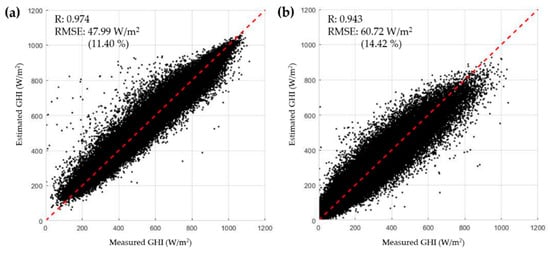 Scatter plots of measured GHI and estimated GHI for (a) a clear sky, (b) a cloudy sky.