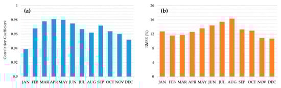 Monthly accuracy variation was also demonstrated, as shown in Table 3 and Figure 8. Summer showed a higher RMSE than other months, and this was most apparent in July and August—the rainy season in Korea. Since estimation errors generally increase in a cloudy sky [,,,], the rainy season showed relatively large errors. January also showed relatively low R and large RMSE values compared to other months, and this might have been caused by the cloud confusion effect from snow. Ground covered by snow shows high reflectance in visible and near infrared channels [], which can cause snow cover to be confused with clouds. This anomaly can reduce accuracy for January—the month with the most snow in Korea. In 2016 and 2017, January showed the deepest snow cover of 7.4 cm and 5.5 cm on average, respectively (kosis.kr). Although the error of the model increased at times of rain or snow, the value of R was at least 0.939 or more, and the RMSE was as low as 68.86 W/m² (rRMSE 16.36%) or less every month. This level of monthly accuracy can be expected whenever the ANN method is applied to solar irradiance mapping for Korea.