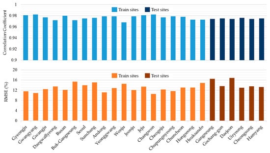 In order to validate the spatial reliability of the ANN model, another ANN model was trained using the data from 19 stations (number of data = 122,669) and applied to the data from the remaining six stations (number of data = 38,436). Table 4 and Figure 9 show the accuracy of each station. Differences of the average R and RMSE (rRMSE) between the training and test sites were 0.002 and 9.34 W/m² (1.71%p), respectively. This result indicates that, if some sites are not included in the training of the ANN model, the errors of solar irradiance estimation for these sites can be larger than the included sites, but the RMSE values were likely to increase only up to ~2%. Thus, ANN model can have significant power in solar irradiance mapping for any site in Korea, within an error range of ~15%.