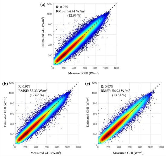 The final ANN ensemble model for solar irradiance mapping in Korea was built by averaging the outputs of 10 independent ANN models, which were trained by randomly setting the training ratio to 70% (number of data points = 112,773) and the test ratio to 30% (number of data = 48,332). The final model showed an overall R of 0.975 and RMSE of 54.44 W/m² (rRMSE 12.93%) (Figure 10a). The training set showed an R of 0.976 and RMSE of 53.33 W/m² (rRMSE 12.67%) (Figure 10b), and the test set showed an R of 0.973 and RMSE of 56.93 W/m² (rRMSE 13.51%) (Figure 10c). Although the training set showed better accuracy than the test set, the differences were marginal: 0.003 for R, 3.6 W/m² for RMSE, and 0.84%p for rRMSE. Therefore, we concluded that this final model showed a minimal overfitting pattern.