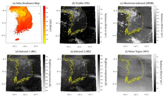 Finally, hourly solar irradiance maps in Korea were generated from COMS images and the ANN ensemble model. Figure 12 shows an example of a generated hourly GHI map and COMS channel images at 14:00 on 1 January 2017 (KST). In Figure 12a, the northwest regions show lower GHI values compared to other regions, while southern regions show higher GHI. From Figure 12b–e, some clouds can be detected in the northwest. Clouds show higher values in the VIS and SWIR channels and lower values in the IR1 and IR2 channels than grounds []. It was found that the clouds had a significant impact on solar irradiance, mainly reducing it []. In addition, although the WV channel did not show a clear trend with solar irradiance in Figure 12f, this channel had a considerable impact on the solar irradiance because the model accuracy became reduced when training was conducted without the WV channel. Actually, water vapor is generally known to influence solar irradiance on the ground, especially in cloudless conditions [].