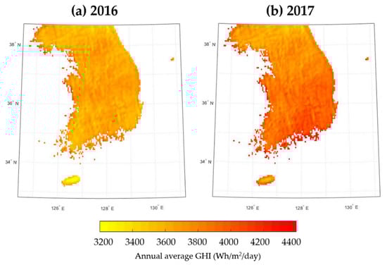 Figure 13 shows annual solar irradiance maps for Korea, for 2016 and 2017. The average solar irradiance was 3654 and 3874 Wh/m²/day for 2016 and 2017, respectively. The spatial distribution of GHI was slightly different between the two years, being higher in the northern region in 2016 but higher in the southeast region in 2017. In both years, relatively low solar irradiance was observed for Jeju Island in the south, and higher irradiance was noted for the western and southern small islands.