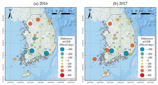 The annual GHI differences between results calculated using satellite data and ground measurement data, for 25 stations, are illustrated in Figure 14. A negative difference means that the GHI map estimation < measurement (underestimation), but a positive difference means that estimation > measurement (overestimation). In the northern stations (6, 7, 17), the GHI map shows that GHI was overestimated in both 2016 and 2017, and an overestimation trend was also shown for the southwest island stations (13, 19). In contrast, the GHI map shows that GHI was underestimated at some southwestern stations (3, 8, 10, 14, 22).