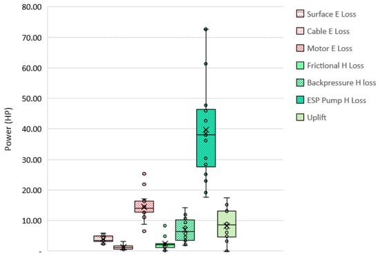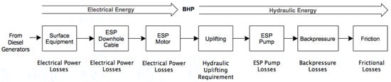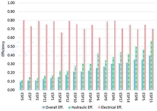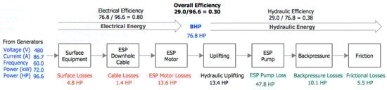Finally, the overall ESP system efficiency can be calculated by multiplying the hydraulic efficiency by the electrical efficiency as described in Equation (20).