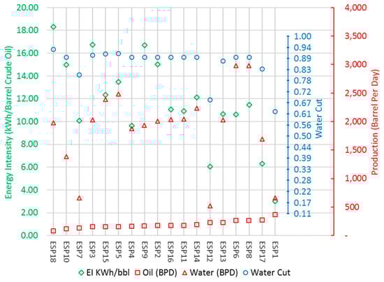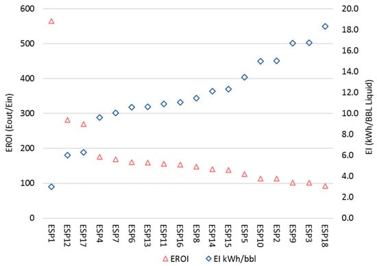 The energy intensity for lifting for each well, as shown in Equation (7), can be found by taking the inverse of the EROI