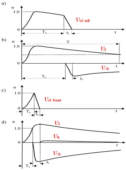 Hence, for chopped lightning impulse on the front Ucl_front, the superposition of full lightning impulse Ul, inverted and shifted one U-ls and additional waveform Uh is performed, as presented in Figure 1c,d and given by the expression: