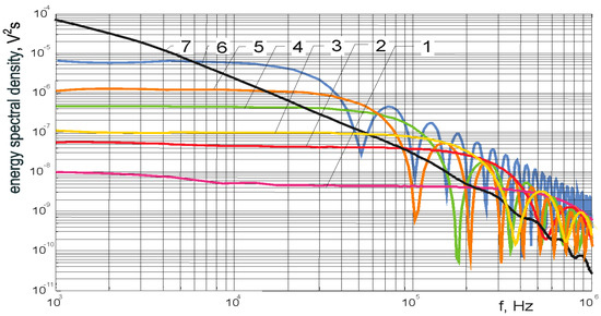 Spectral content of chopped and full lightning impulse (FLI). Delay time to chopping respectively: (1) 0.8 µs, (2) 2 µs, (3) 2 µs, (4) 6 µs, (5) 10 µs, (6) 20 µs, (7) FLI.