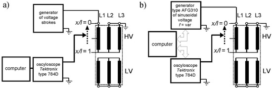 The measurement on transformer windings were performed, both in time and frequency domain, in a setup presented in Figure 3. The lightning voltage pulses were generated by a lightning stroke unit with maximum amplitude 300 V. The test waveforms with oscillating component as well as the measurements in frequency domain from 20 Hz to 2 MHz were performed using programmable function generator Tektronix type AFG310 with maximum output voltage 20 V. It is important to notice that the magnitude of the generated voltage waveforms used in experiments does not have a practical impact on measurement results. The influence of the ferromagnetic transformer core in the analysis of transients is often a subject of discussion. The contentious issue concerns the cutoff frequency of transformer core impact. Usually, referring to the investigations done by Wilcox [28], in a frequency range above several dozens of kHz, the impact of the core is neglected. Hence, in this high frequency band, the windings can be treated as linear objects and the magnitudes of applied voltage stimuli do not influence the measurements. For the acquisition of the overvoltage waveforms, an oscilloscope Tektronix model 784D was used as in the configuration shown in Figure 3a. The frequency characteristics of the windings were obtained in the computer controlled configuration. The generator was programmed to yield the sweep in predefined frequency range (up to 2 MHz) and the corresponding response was acquired by an oscilloscope. Both the programmable function generator and the scope acting as a recorder were linked with a control computer by GPIB-USB. The control and analysis software was developed in LabView™ environment from National Instruments [3,10,26,29].