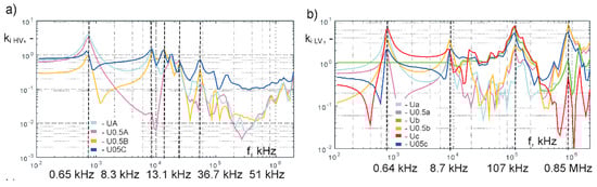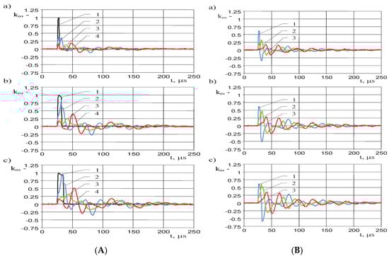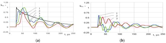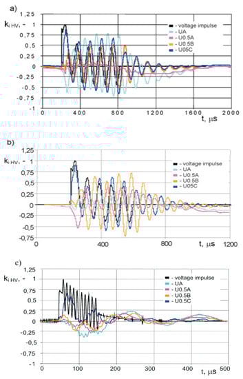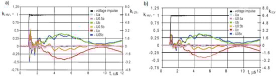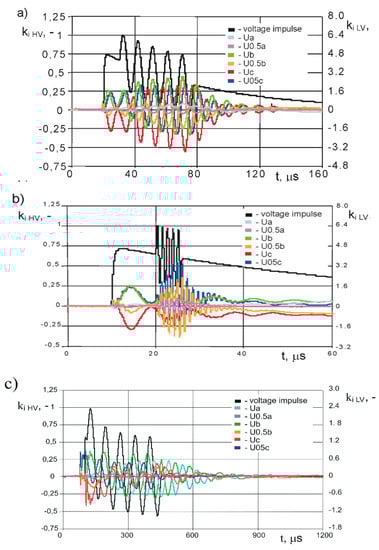 Similar measurement have been performed on LV winding, adjusting the wavelet frequency to the resonances in frequency characteristic (Figure 4), i.e., 107 kHz, 0.85 MHz. The results presented in Figure 12 also indicated strong amplification of the oscillating overvoltages in LV windings, for example in the case of frequency 0.85 MHz, the overvoltage coefficient for voltage U0.5c is equal to 3.4 and for voltage Ua is about 1.5. Analyzing the de-tuned case, overvoltages generated in HV winding excited by the lightning impulse containing oscillating wavelet having frequency 14.6 kHz (Figure 12c) are significantly smaller than for cases of resonance frequencies.