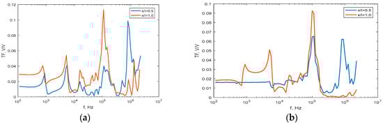 Transfer frequency characteristic of overvoltages at winding terminal (x = 1.00) and for point in half of windings and ground (x = 0.50): (a) injection HV windings phase A, response LV winding phase “a”, (b) injection HV winding phase C, response LV winding phase “c”.