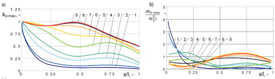 (a) Maximal values of overvoltages and (b) overvoltage gradient for full (FLI) and chopped lightning impulse, with time to chopping: (1) 1 µs, (2) 2 µs, (3) 4 µs, (4) 6 µs, (5) 10 µs, (6) 20 µs, (7) 30 µs, (8) 50 µs, (9) FLI.