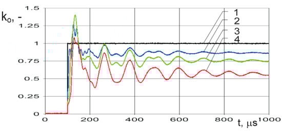 Overvoltages excited by rectangular impulse in the HV winding at tap: (1) x/l = 0, (2) x/l = 0.2, (3) x/l = 0.3, (4) x/l = 0.7.