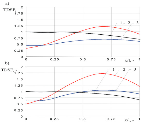 Assessment factor TDSF = f(x/l) for HV winding excited by standard full lightning impulse Utest = 95 kV of experimental transformer protected by two models of surge arresters: (a) Uc = 12 kV (SA1), (b) Uc = 18 kV (SA2); 1—standard full lightning impulse, 2—sinusoidal wavelet with resonance frequency 13.1 kHz, 3—rectangular impulse.