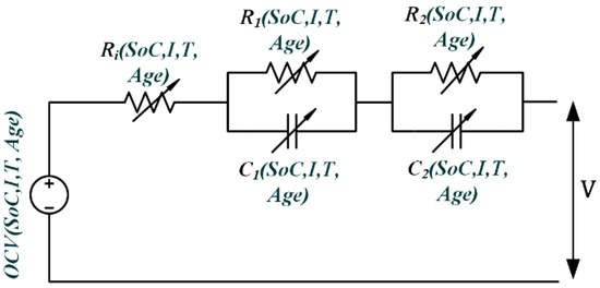 Second-order equivalent circuit (SOEC) battery cell model.