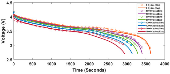 Figure 3 provides a comparison between the simulated and experimental discharge voltages at different aging levels of the NMC battery cell, at a 25 °C and 3C discharge rate, that were recorded as a result of accelerated aging tests. The mathematical representation of the output voltage characteristics for the second-order ECM is given in [33], and the SoC is estimated by the coulomb counting method [34].