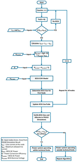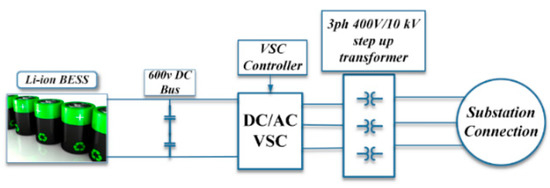 A typical topology for the integration of BESS in utility grid applications is presented in Figure 4, which is deployed as a reference for the battery sizing algorithm presented in the next subsection. The nominal BESS voltage (VDC,BESS) is considered as 600 V, which is connected to the DC bus. The DC/AC converter connected with the DC bus converts 600 VDC power to three-phase, 400 VRMS AC power. In the Åland Island case, the voltage will be boosted to a 10 kV level by means of a three-phase transformer. The allocation of BESSs in the substation is designed from the voltage, current and power flow data obtained from PSCAD EMT simulations. Results from the simulation provides data input on loading information of each power transmission line and the status (i.e., voltage levels and current flows) at every operational substation.
