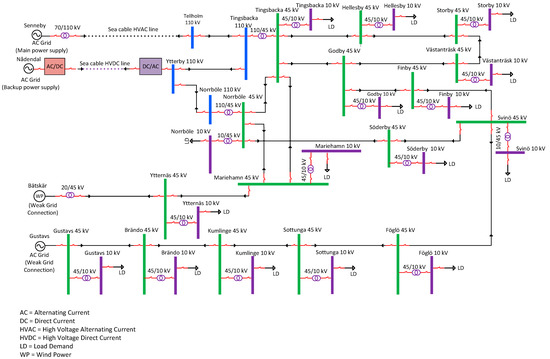 The minimum generation and maximum loading cases for 2022 and 2030 are considered in such a way that power supplies from Bätskär and Nådendal are not operational in the simulation model. By considering the above operational criteria along with the predicted load demand for the years 2022 and 2030, the basic single line diagram of the simulation model is shown in Figure 8. Thus, the current operation of power system in the Åland Islands can form two possible islanded sections of the network in radial topologies.
