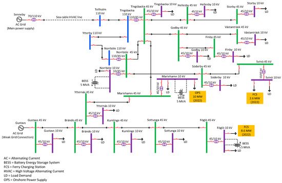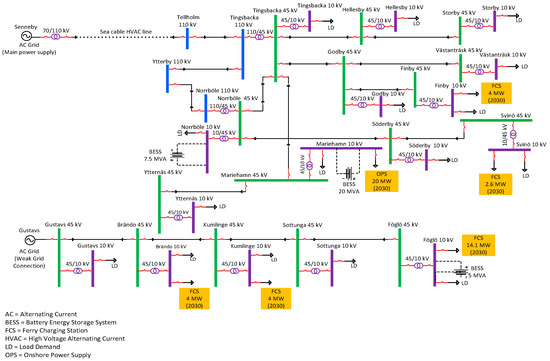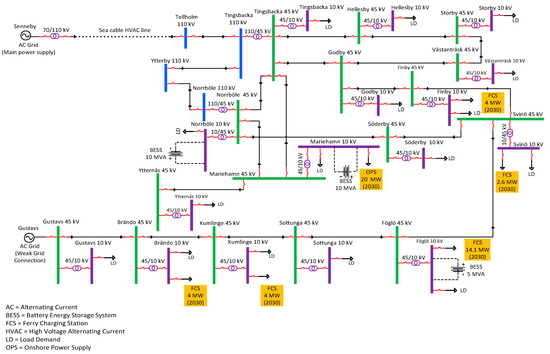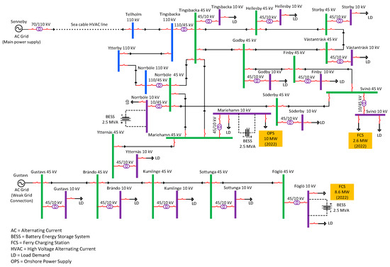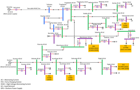 The geographical location of the grid structure of the Åland Islands, located in the Baltic Sea in Finland, is shown in Figure 6, and a simplified single line diagram is shown in Figure 7. There are two power transmission lines of 110 kV supplied from Senneby (Sweden) and Nådendal (Finland). In addition to the 110 kV transmission lines, two other power transmission lines of 45 kV are supplied from Båtskär (wind park) and Gustavs (Finland). Senneby is an HVAC (high voltage alternating current) transmission line, which is the main power supply for the whole network, whereas Nädendal is an HVDC (high voltage direct current) transmission line, which is used as a backup power supply for the network. Bätskär and Gustavs have weak grid connections because of the intermittent nature of the power supplied from wind power generation. The Föglö substation is currently not operational, but keeping in mind the future marine load demand and integration of renewables, it will be installed between Svinö and Sottunga substations. Moreover, each 45 kV substation is also connected to a 10 kV substation with step down transformer(s) of 45/10 kV to supply marine and other harbour loads. The Åland Islands grid is a quite small and weak power system with many potential medium-size/small harbour areas for future ferry/ship charging stations and the integration of a large amount of RESs. Electric ferries are used for transportation between multiple islands. Typically, the Åland Islands grid is supplied with power from Sweden and Finland. Åland’s power system has several substations with different load requirements and the possibility of more than one topology for connecting one substation to another substation. Regarding future load demand, Åland Islands stakeholders are planning to integrate a large amount of renewables (photovoltaic and wind power) in the years 2022 and 2030 with targets to electrify transportation in the main island and between multiple islands. Therefore, significant development in the power system’s infrastructure will be needed. This development is considered in two phases for the years 2022 and 2030, which will encounter an increase in the penetration of renewables as well as power demand from electric ferries/ships requiring an onshore power supply and the recharging of on-board batteries at harbours.