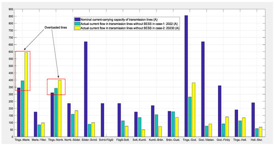 Nominal and actual current flows in transmission lines for the year 2022 with BESSs.